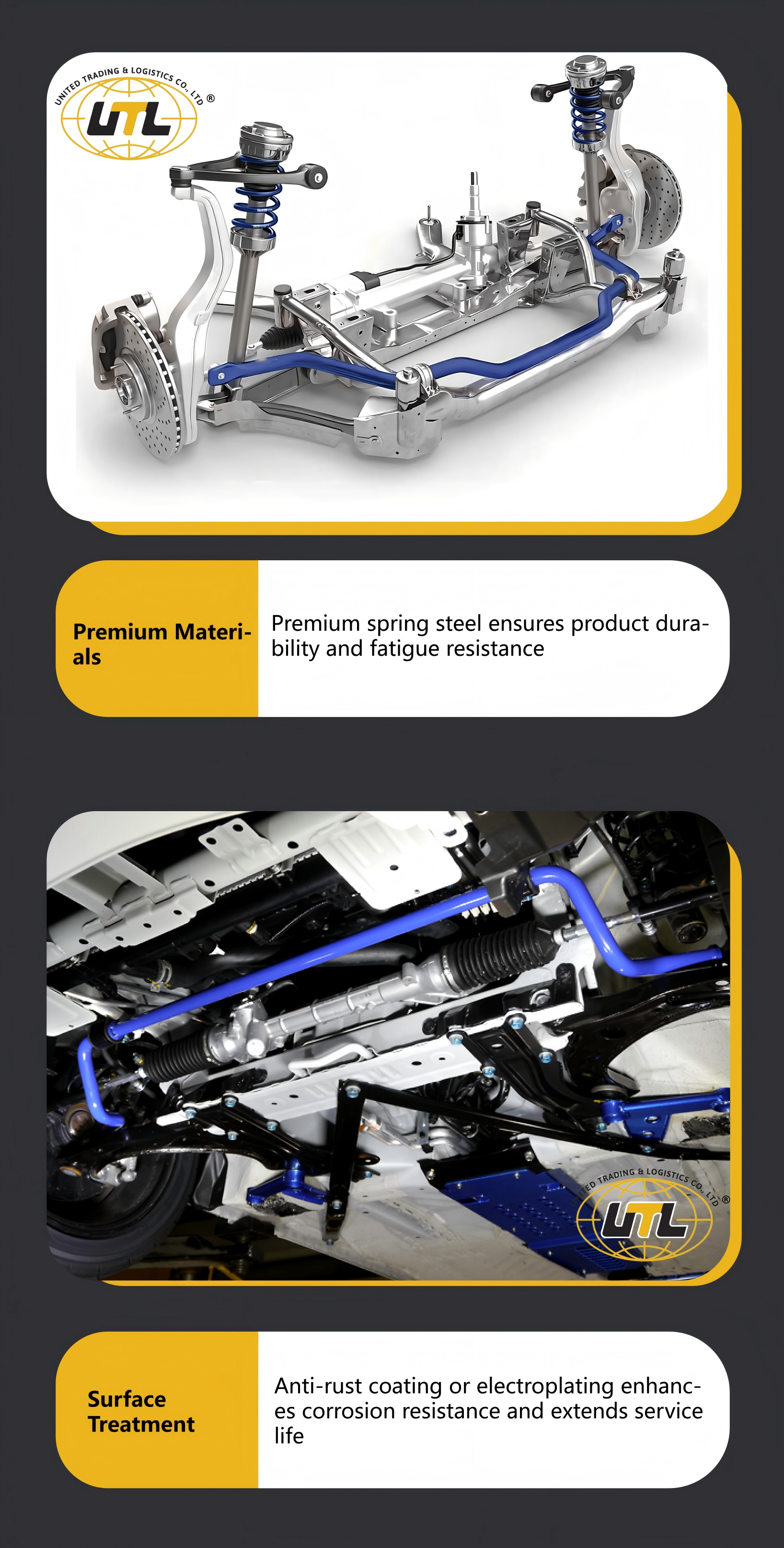 Feature: High-strength alloy steel construction with U-shaped design, connected to suspension via end links
