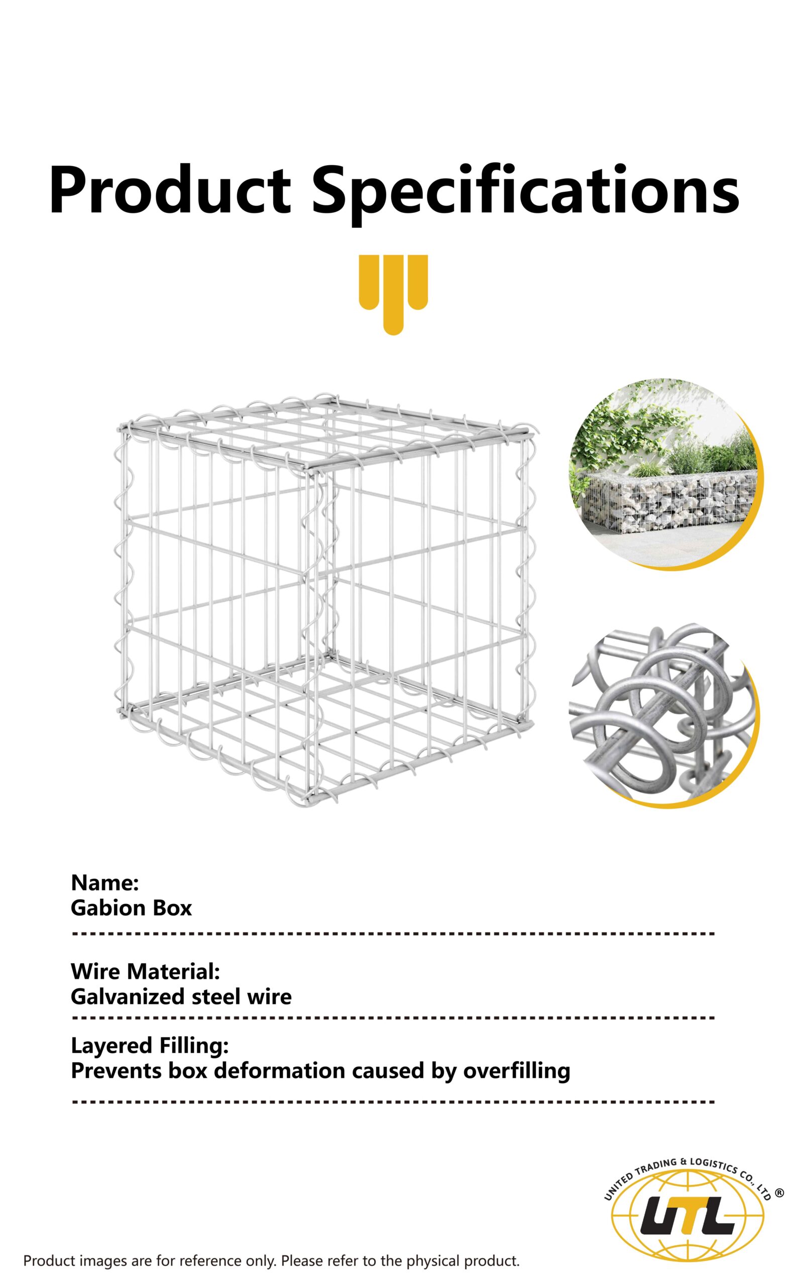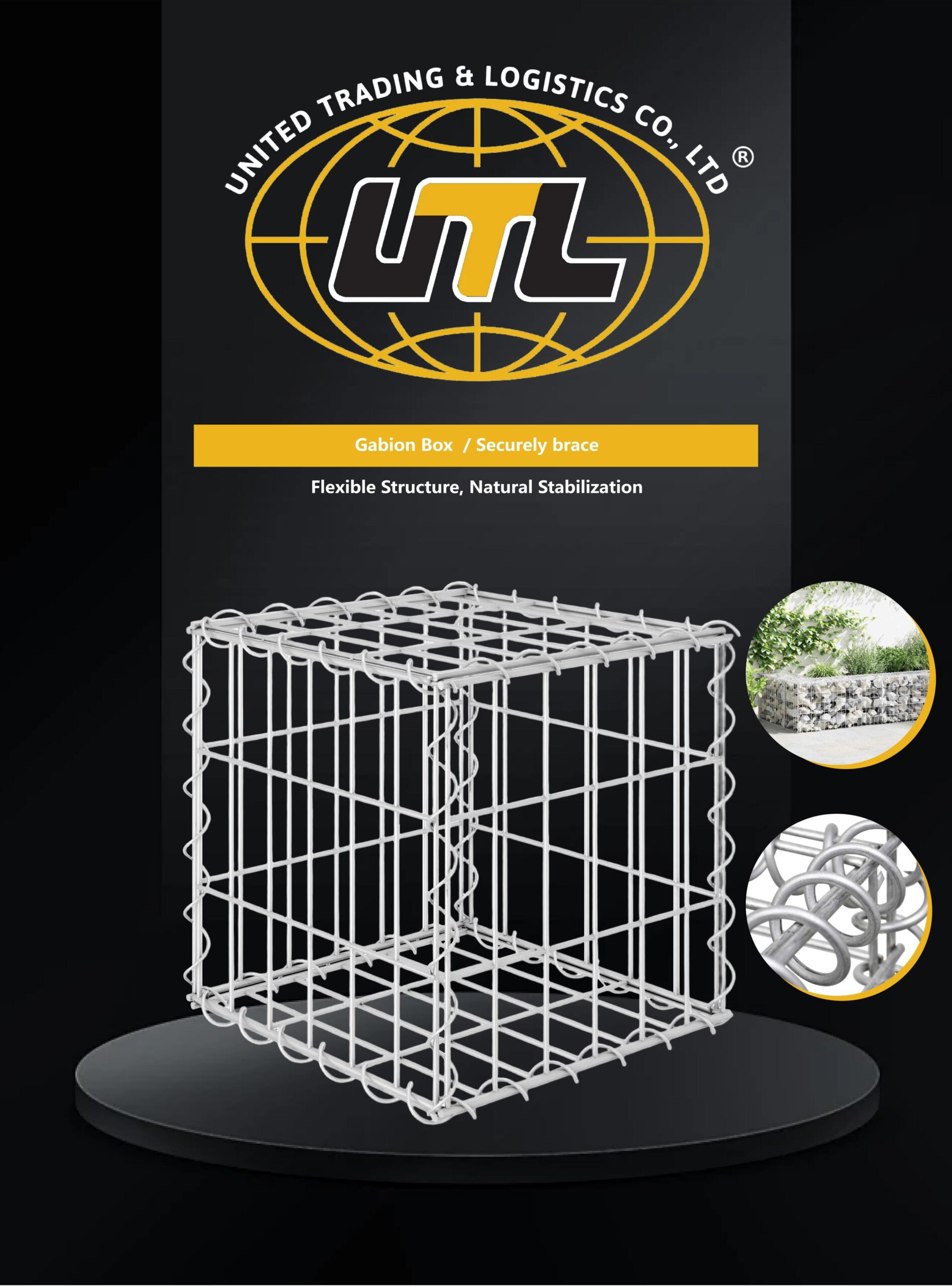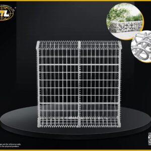 منسوج من سلك فولاذي مجلفن عالي الشد إلى شبكة سداسية مزدوجة الالتواء. تصميم صندوق وحدوي للتجميع في الموقع وملء الحجارة.