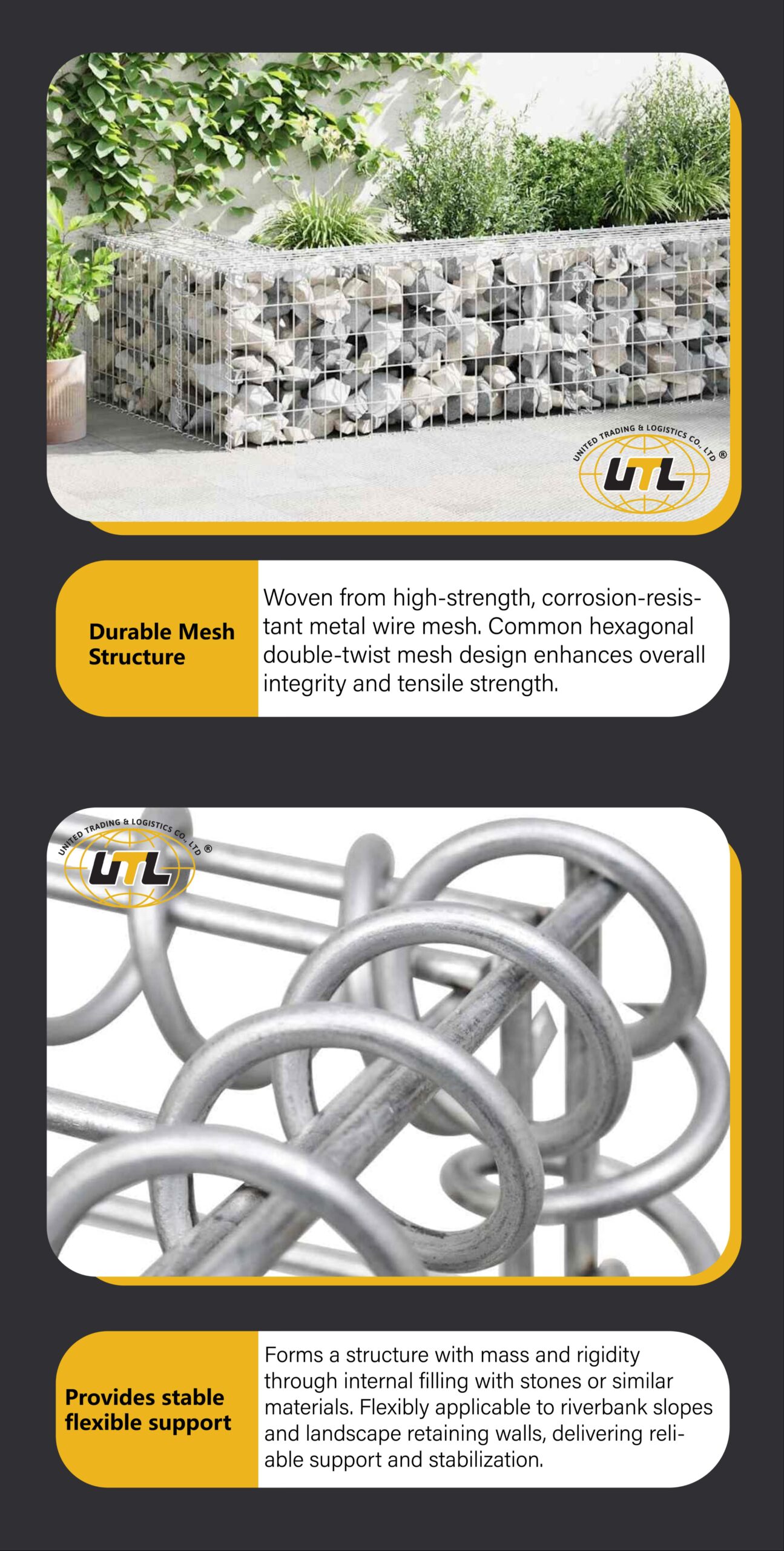 Provides a flexible, permeable, and stable solution for slope protection, retaining walls, and riverbank reinforcement, effectively resisting water erosion and soil pressure.